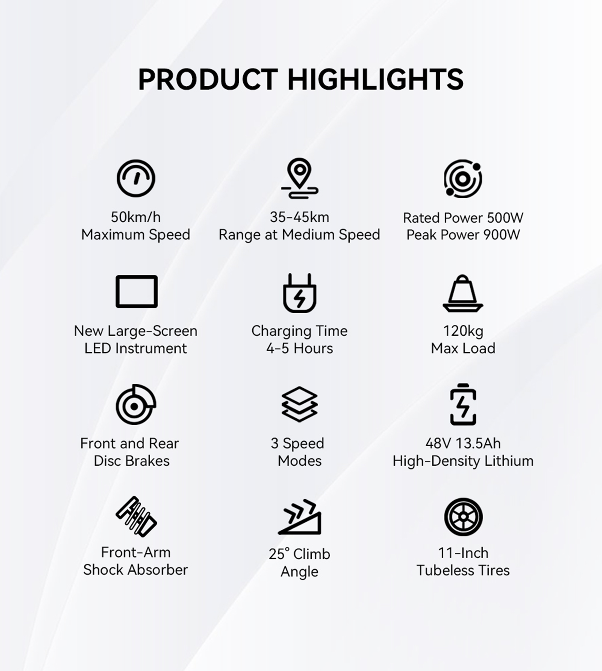 900W motor | 48V 13,5AH batteri | 50 km/h hastighet | 35–45 km räckvidd